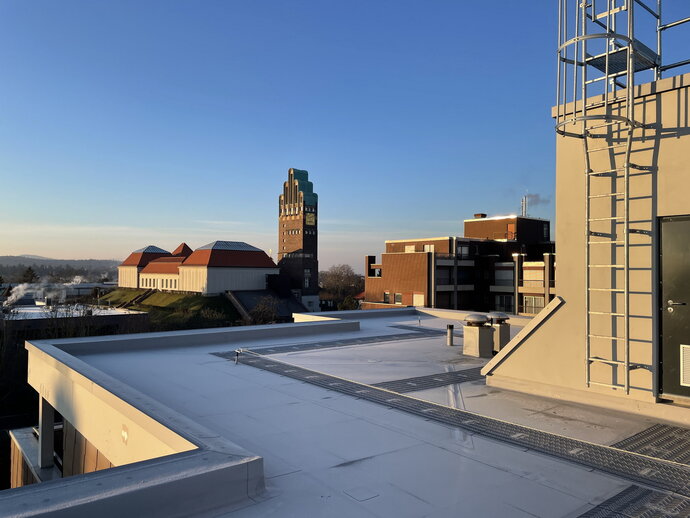 Das Dach eines siebengeschossigen Wohngebäudes aus den 1980er Jahren in direkter Nachbarschaft zum UNESCO Welterbe Mathildenhöhe Darmstadt wies nach vier Jahrzehnten einige Undichtigkeiten auf, sodass die Eigentümer die anstehende Instandsetzung auch zu einer energetischen Modernisierung nutzen wollten. Hierzu wurde der ursprüngliche Aufbau bis auf den Rohbau komplett entfernt und mit einem zeitgemäßen Wärmeschutz nach den Richtlinien der Bundesförderung für effiziente Gebäude (BEG) ausgestattet. In diesem Zuge wurden auch die Belichtungsöffnungen für den Treppenraum ersetzt sowie die Außenwände des Technikgeschosses ertüchtigt und das Dach mit einer neuen Abdichtung inklusive Leckage-Ortungssystem und elektronischem Monitoring des Feuchtegehalts versehen.