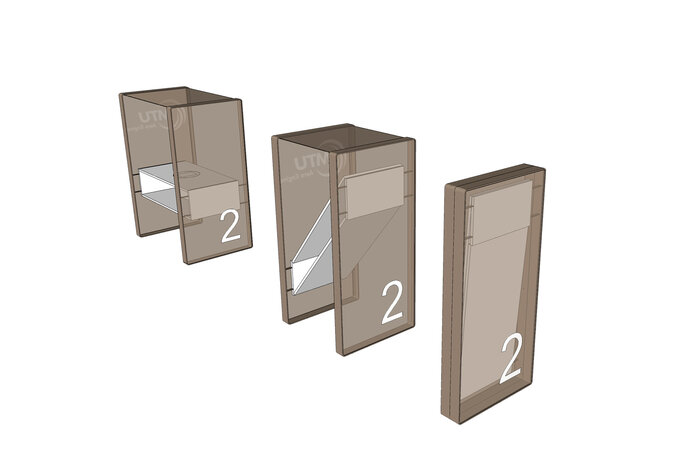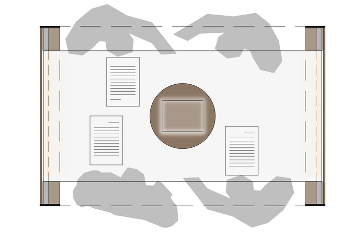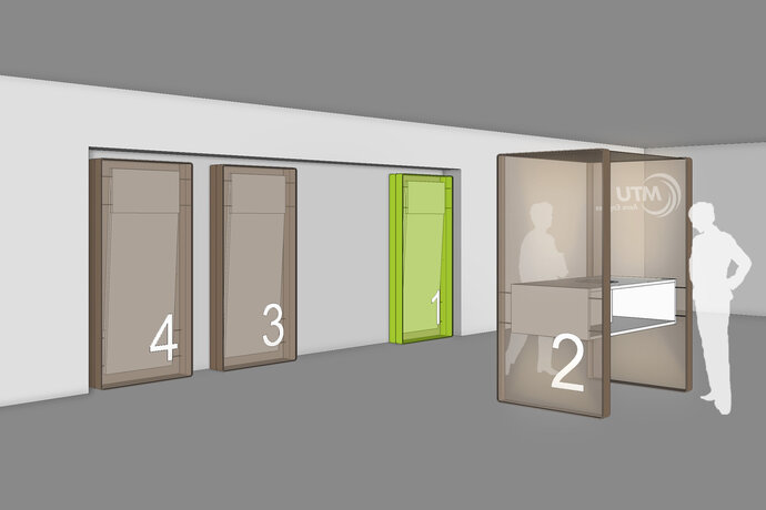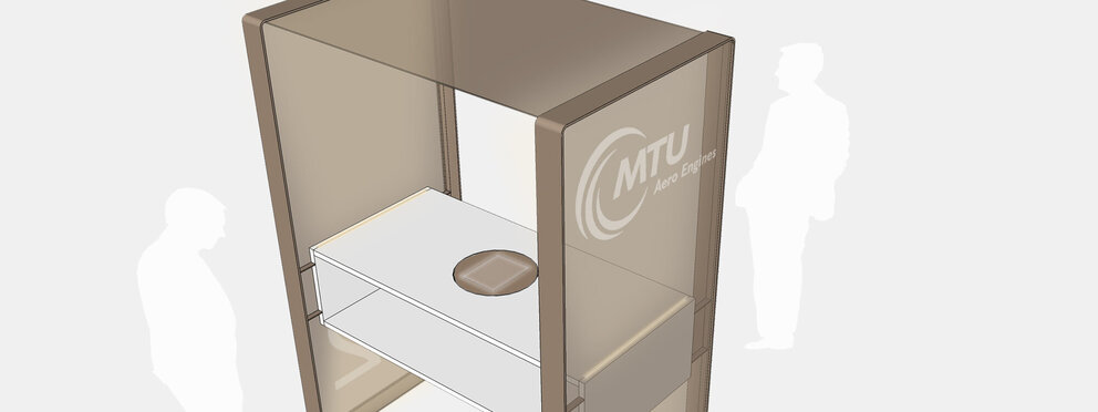 Für die Umsetzung einer mobilen Besprechungseinheit wurde ein Möbelkonzept als Leichtbaukonstruktion entwickelt. Das Möbel besteht aus zwei Aluminiumrahmen mit textiler transluzenter Rahmenbespannung und einem klappbaren, verfahrbaren Möbelkorpus. Ein integriertes drehbares Touchpanel ermöglicht mediale Präsentationen. Die Gestaltung der textilen Bespannung mit Firmen-CI und Hinterleuchtung rundet das Konzept ab.