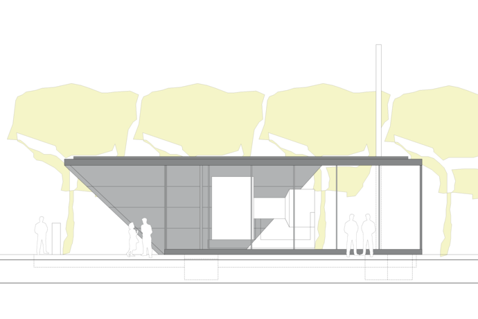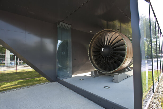 Zur Präsentation einer Flugzeugturbine wurde am Zugang eines Werksgeländes ein Ausstellungsgebäude positioniert. Formensprache und Materialität sind aus dem Flugzeugbau abgeleitet. Die geschosshohe Verglasung eröffnet den Blick auf das Ausstellungsobjekt und lässt sich in Teilbereichen verfahren. In der Dämmerung wird die Turbine durch eine spezielle Exponatbeleuchtung in Szene gesetzt.