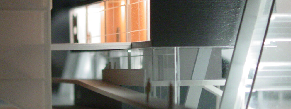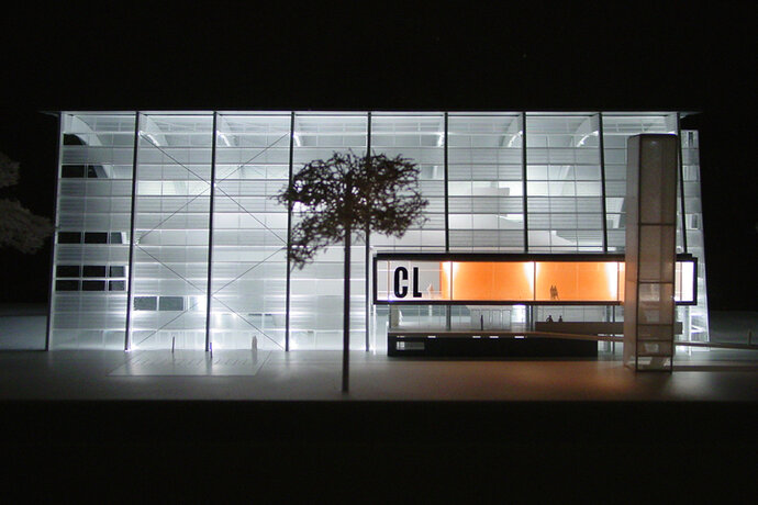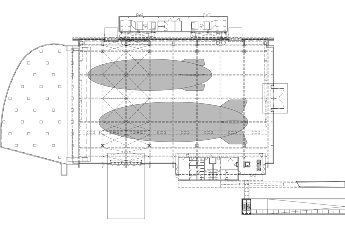 Der Entwurf einer neuen Wartungshalle für zwei kleinere Luftschiffe mit integriertem Besucherbereich sieht eine großzügig verglaste Fassade vor. Eine Stirnseite wird durch ein überfahrbares Klapptor gebildet, das hydraulisch betätigt das gesamte Hallenprofil freigibt und von einer entsprechend geformten Bodenvertiefung aufgenommen wird.