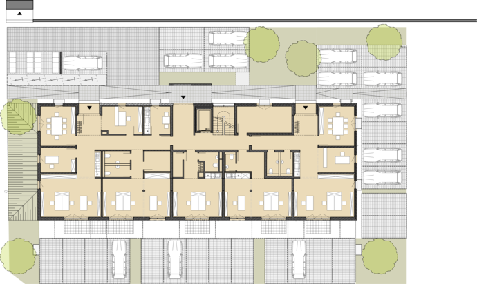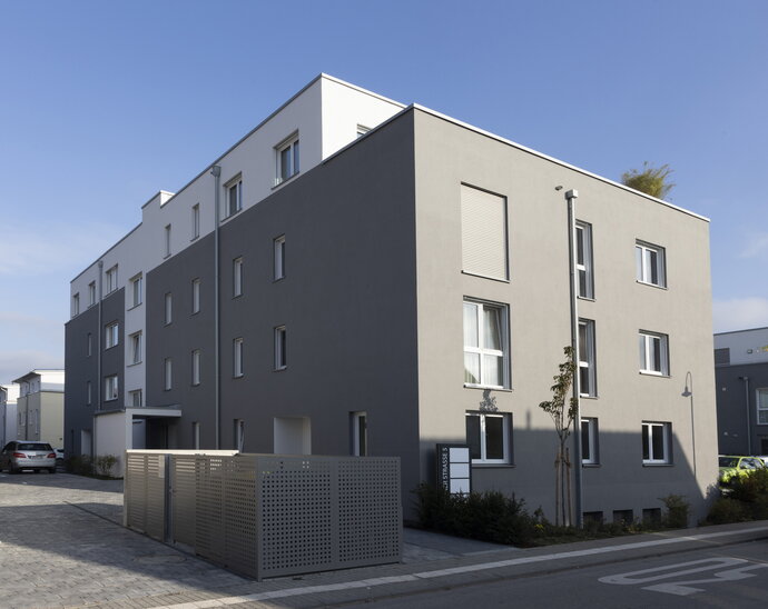 Das Gebäude bildet den Abschluss eines neu entwickelten Mischgebiets auf einem zuvor rein gewerblich genutzten Gelände. Die Lage des Grundstücks in einem Überschwemmungsgebiet führte dazu, dass die Nutzung des Untergeschosses als Tiefgarage nicht infrage kam. Stattdessen war der geamte Keller als Retentionsvolumen auszubilden, das bei Hochwasser geflutet werden kann, und die erforderlichen Stellplätze oberirdisch nachzuweisen. Neben flexibel zusammenschaltbaren Gewerbeeinheiten im Erdgeschoss konnten zwölf Wohnungen in den Obergeschossen angeordnet werden, davon zwei im Staffelgeschoss mit großzügigen Dachterrassen.