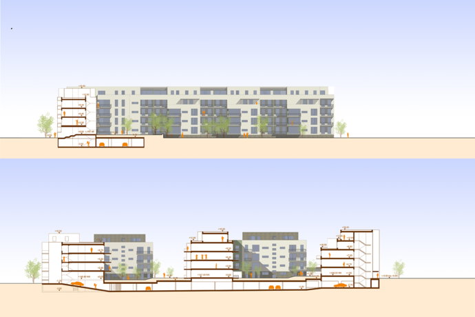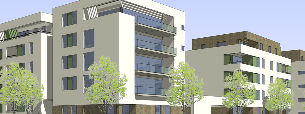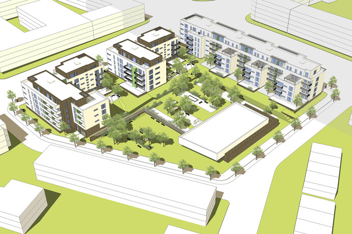 Die Planung sieht eine Bebauung des Grundstücks mit Wohngebäuden und integrierten Gewerbeflächen vor. Die vorgeschlagene Anordnung der Baukörper berücksichtigt sowohl die städtebauliche Betonung des öffentlichen Raums als auch die Anforderungen an die Privatheit der Wohneinheiten. Alle Gebäude sind direkt vom Straßenraum her zugänglich und als Adressen ablesbar. Die Freianlagen sind als terrassierte Anlage gestaltet und differenzieren deutlich zwischen privatem und öffentlichem Raum.