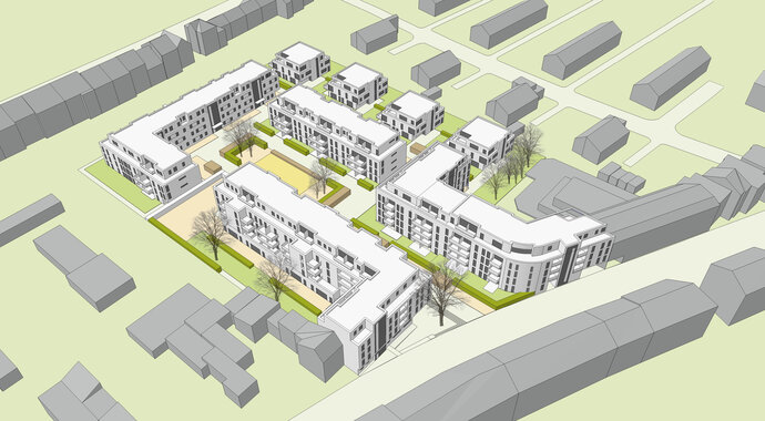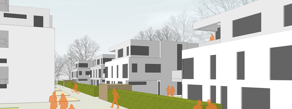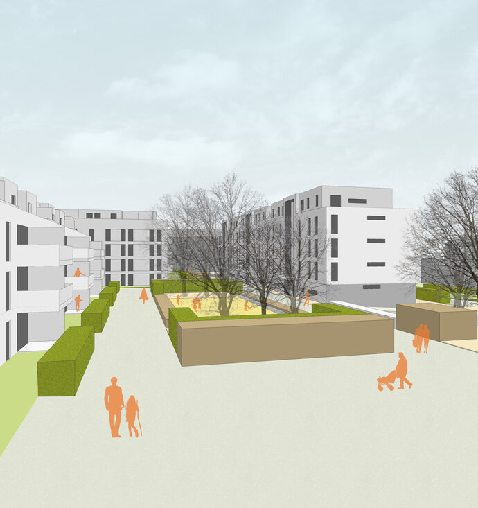 Die Planung sieht eine Bebauung mit Wohngebäuden und Kindertagesstätte vor. Das Konzept beinhaltet eine Differenzierung der Wohngebäude hinsichtlich Typologie und Höhenstaffelung, um sich in die vorhandene Umgebung optimal zu integrieren. An der Zufahrtsstraße wird der Blockrand gezielt unterbrochen und durch eine abgerundete Bauform dynamisch auf das Grundstück geführt, sodass ein großzügiges Entrée mit einem Vorplatz entsteht. Die Gestaltung der Freianlagen sorgt für eine angenehme Unterscheidung zwischen privatem und öffentlichem Raum.
