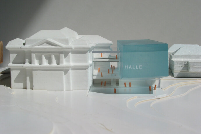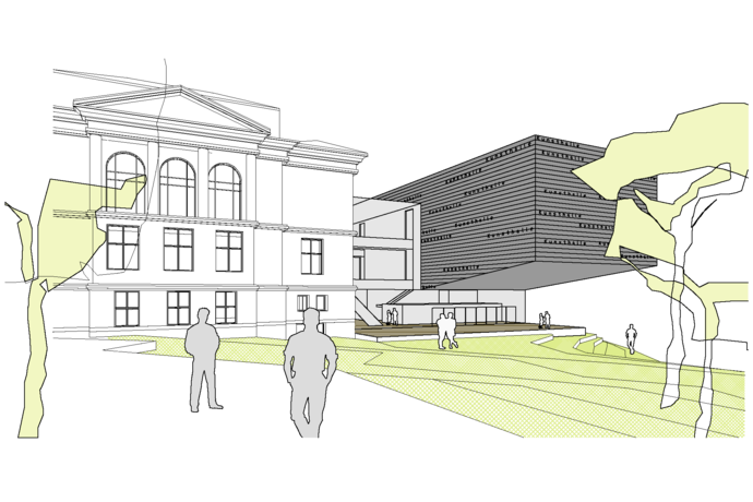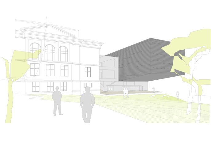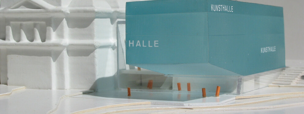 Für die Erweiterung der Kunsthalle wird ein einfacher, kompakter Baukörper vorgeschlagen, der sichtbar vom Altbau abgerückt ist und dem denkmalgeschützten Gebäude den Vortritt lässt. Die Raumwirkung ist geprägt durch den Kontrast zwischen offenen und geschlossenen Funktionsbereichen. Dabei bleibt die Distanz zum Hauptgebäude immer gewahrt. Der Zwischenraum dient als Zugang, Verteiler und Orientierungspunkt am Übergang zwischen Alt und Neu.