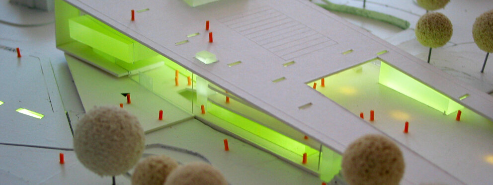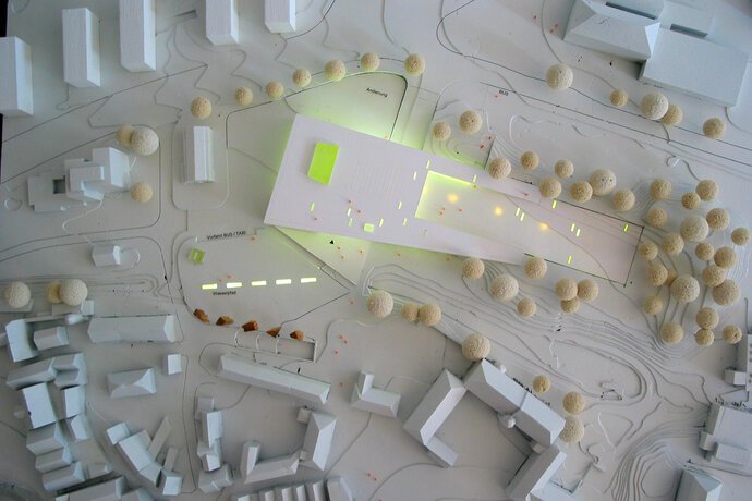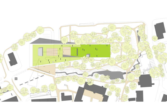 Aufbauend auf der vorgegebenen Tiefgaragenstruktur entfaltet sich der Baukörper längs der Achse des Stadtparks und erweitert durch das begehbare Dach die vorhandene Freifläche zu einem gemeinsamen Aktionsraum.